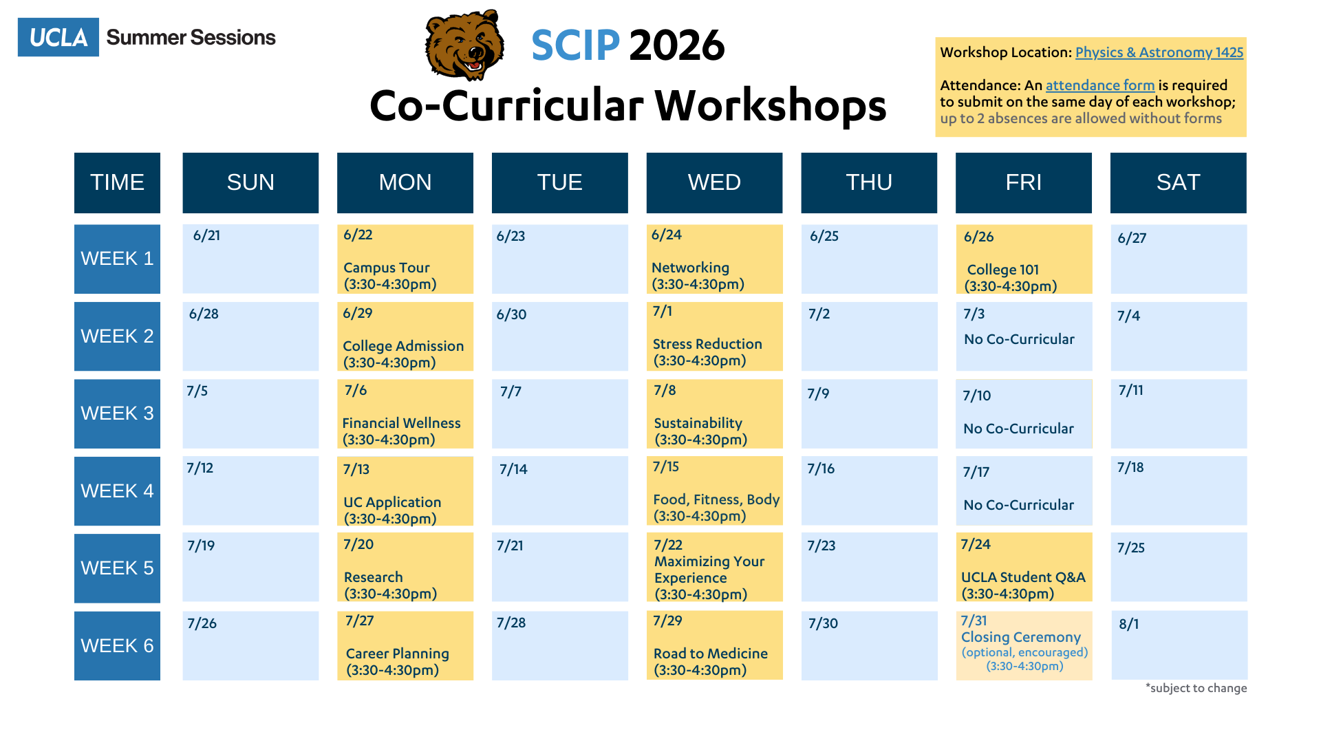 SCIP Co-Curricular Workshops help participants gain knowledge and skills that are necessary to navigate college admission and academic life. Students will be expected to join the mandatory, live presentations in person on Mondays, Wednesdays, and Fridays from 3:30-4:30pm (PDT) in Physics and Astronomy 1425.